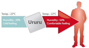 Nawilżanie po japońsku to "Ururu". Do nawilżania nie jest potrzebny zbiornik wody. Wilgoć jest pochłaniana z agregatu zewnętrznego i kierowana do jednostki wewnętrznej, gdzie jest równomierne rozprowadzana po całym pomieszczeniu. Nawilżanie pomaga zapobiegać suchości gardła i wysuszaniu skóry, a także zapewnia ciału uczucie ciepła, nawet w niższych temperaturach, redukując dzięki temu zapotrzebowanie na ogrzewanie oraz zużycie energii.